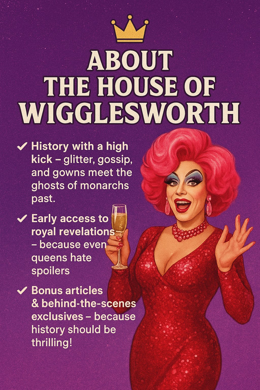 Welcome, my dazzling darlings, to The House of Wigglesworth — where glamour reigns supreme and every entrance deserves applause!